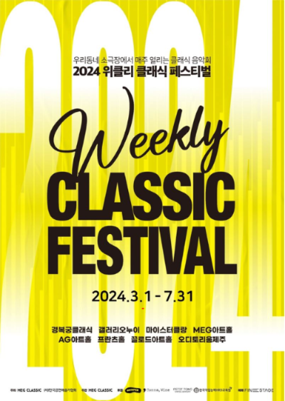 우리동네의 소극장 클래식 음악회. 2024년에는 전국의 8개 공연장에서 3월에서 부터 7월까지 개최됩니다. 정통 클래식을 비롯하여 재즈, 국악, 뉴에이지, 남미 음악에 이르기까지 다양한 장르의 음악을 즐기실수 있습니다. 공연장은 서울종로의 경복궁 클래식, 서울 동작의 갤러리 오누이, 경기 광명의 마이스터클랑, 경기 오산의 MEG아트홀, 충북 청주의 AG아트홀 대구 남구의 프란츠홀, 제주 애월의 오디토리움, 제주 서귀포의 끌로드아트홀이 있습니다.